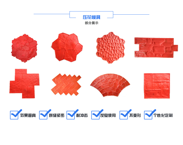 5、使用藝術地坪模具對地坪面層進行紋理處理。藝術地坪模具應配套使用,首先確定好紋理的分布方向,選好一塊模具放置的位置和角度,然后其它的模具依次緊貼一塊模具放置。彩色混凝土藝術地坪壓模采用壓模,壓模應由技術較好的人員進行作業(yè)以保證壓紋深度一致和模具放置的準確性。