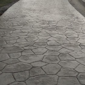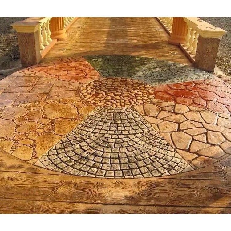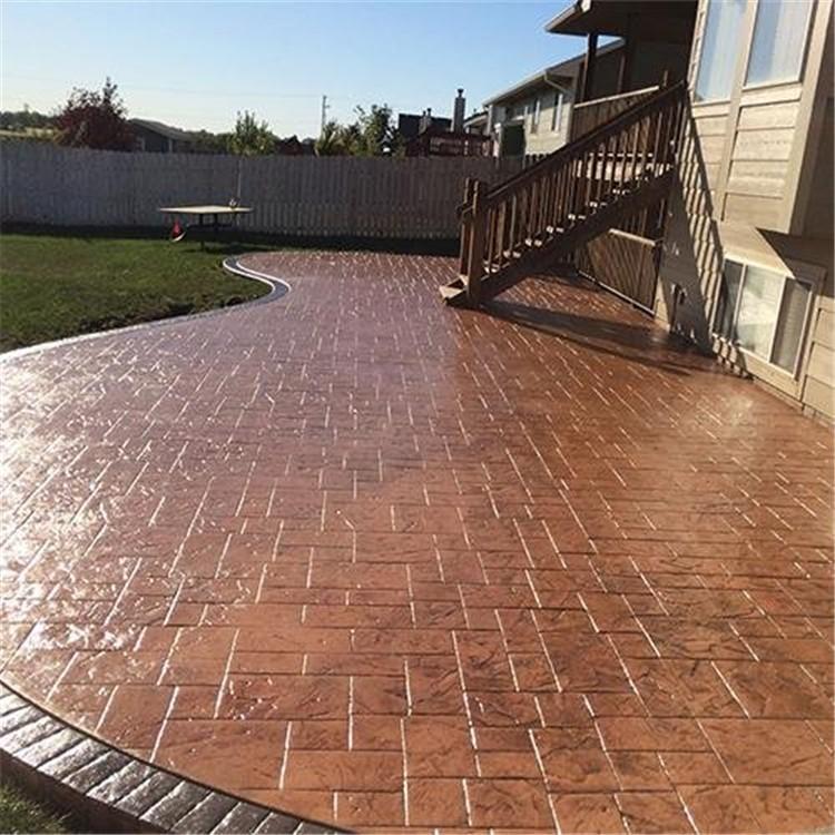 5、使用藝術地坪模具對地坪面層進行紋理處理。藝術地坪模具應配套使用,首先確定好紋理的分布方向,選好一塊模具放置的位置和角度,然后其它的模具依次緊貼一塊模具放置。彩色混凝土藝術地坪壓模采用壓模,壓模應由技術較好的人員進行作業以保證壓紋深度一致和模具放置的準確性。