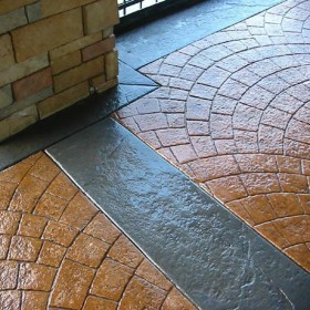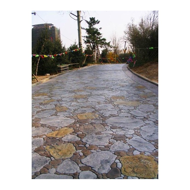 提漿收光 → 播撒強化料 → 精收光 →補強化料 →二次收光→撒脫模粉→用模具壓印地面→封閉道路→沖洗藝術地面→涂刷保護劑→完工