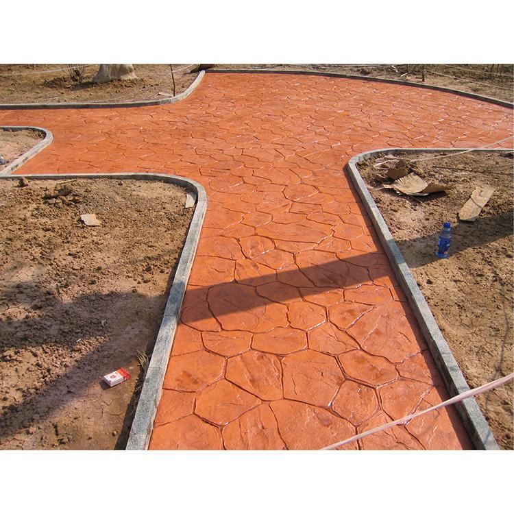 產品特點是能夠直接在混凝土上非常逼真地模仿許多建筑裝飾材料的質地及色澤,呈現出的效果酷似天然的青石板、木板、火山巖石等等。它能夠刻意表現出自然材質的粗礪,凹凸不平和復雜紋理,整體成型,一次性鋪裝,施工快,同時又解決了普通彩色道磚的整體性差,高低不平易松動,使用周期短等缺點。
