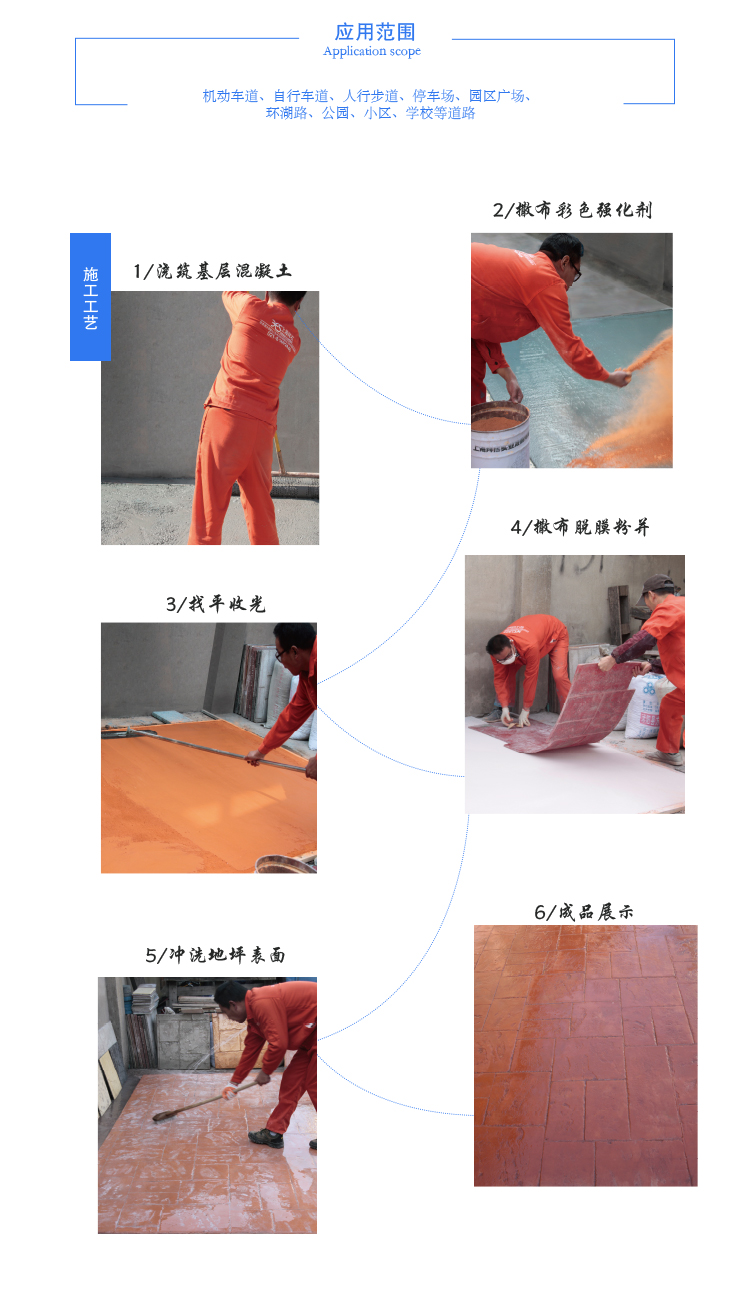 提漿收光 → 播撒強化料 → 精收光 →補強化料 →二次收光→撒脫模粉→用模具壓印地面→封閉道路→沖洗藝術地面→涂刷保護劑→完工