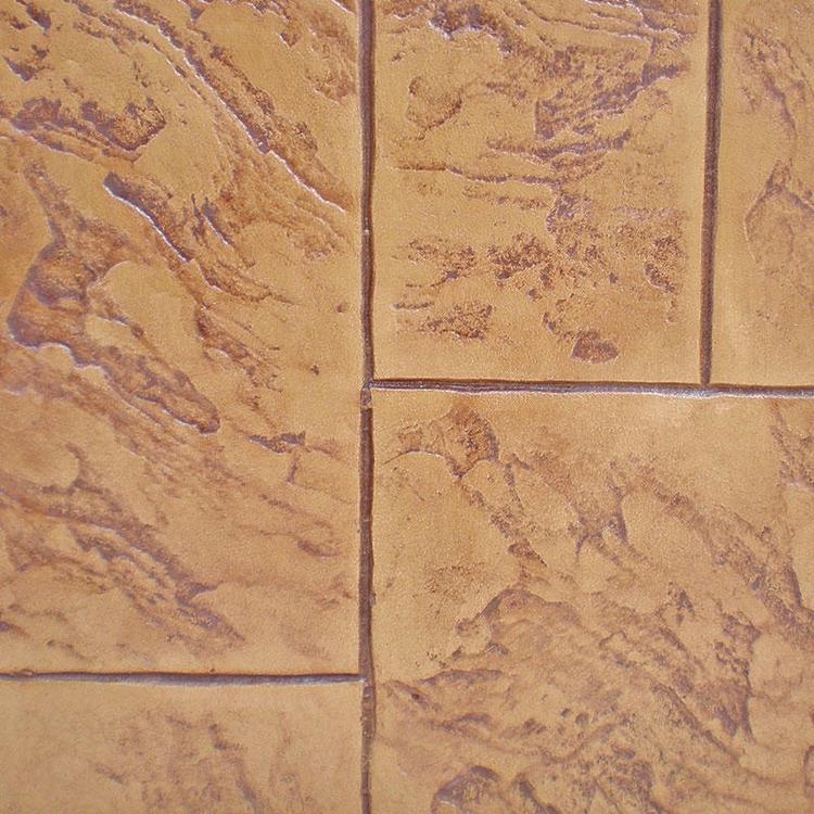 5、使用藝術地坪模具對地坪面層進行紋理處理。藝術地坪模具應配套使用,首先確定好紋理的分布方向,選好一塊模具放置的位置和角度,然后其它的模具依次緊貼一塊模具放置。彩色混凝土藝術地坪壓模采用壓模,壓模應由技術較好的人員進行作業以保證壓紋深度一致和模具放置的準確性。