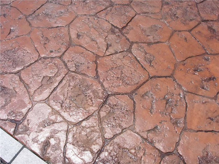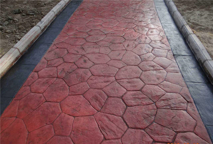 5、使用藝術地坪模具對地坪面層進行紋理處理。藝術地坪模具應配套使用,首先確定好紋理的分布方向,選好一塊模具放置的位置和角度,然后其它的模具依次緊貼一塊模具放置。彩色混凝土藝術地坪壓模采用壓模,壓模應由技術較好的人員進行作業以保證壓紋深度一致和模具放置的準確性。