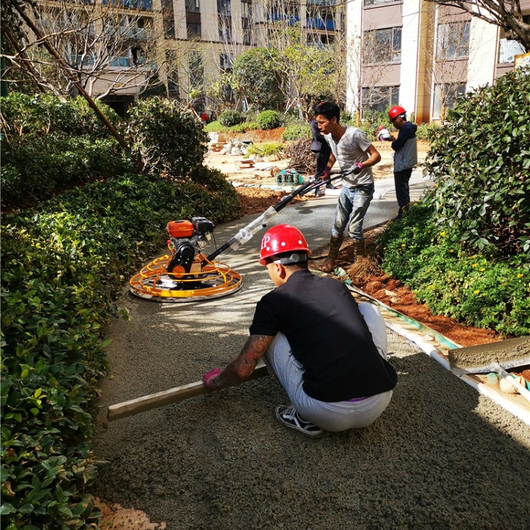 1、混凝土以后,當混凝土初凝由施工人員采用大抹刀對混凝土表面進行收光。收光時應注意表面上是否存在浮漿,如果有多余的浮漿,應刮出。提漿的作用是將彩色強化料與砼完整結合,收光過程中若出現有較大的骨料(石塊)浮在表面應撿出。